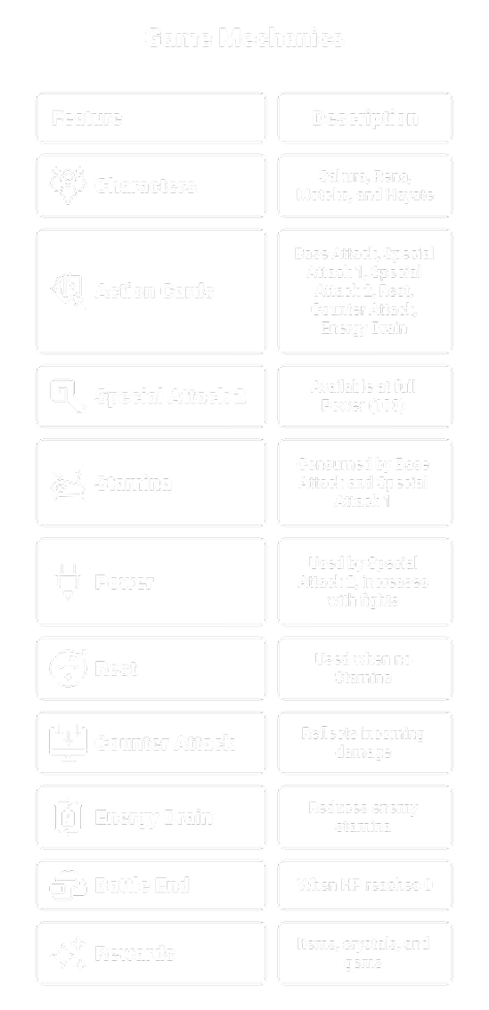 Characters: PvE would involve the player choosing one of the available Characters (Sakura, Rena, Motoko, and Hayate) to control against non-player enemies.Combat: The core combat loop would involve managing Stamina (consumed by Base Attack and a Special Attack) and using Rest to recover it.Special Abilities: Players would need to build up Power through fights to unleash a Power Attack, which is Available at full Power (100) for high damage. They could also utilize a Counter Attack to Reflect incoming damage from the AI opponents and use Energy Drain to Reduce enemy stamina, thereby controlling the pace of the fight.Objective/Progression: The PvE goal is to reduce the enemy's HP to 0, leading to a Battle End. Upon winning the battle, the player would receive Rewards such as Items, crystals, and gems to enhance their character, allowing them to take on tougher PvE challenges.