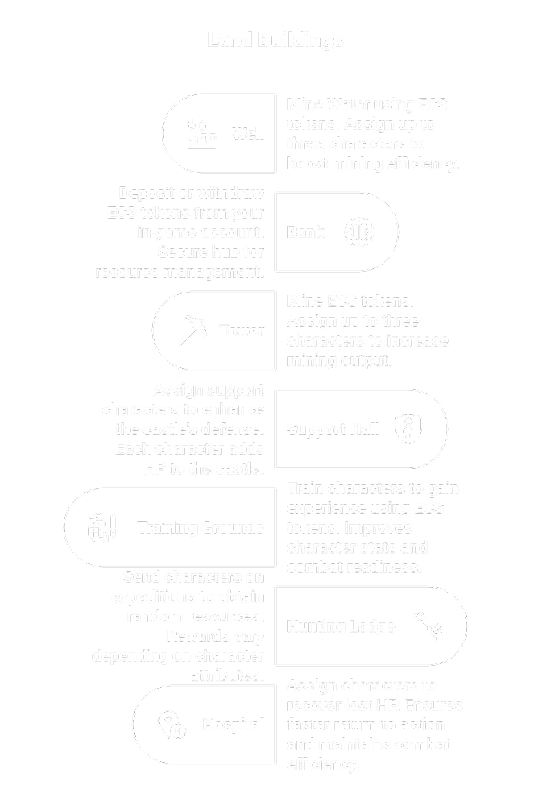 The Well, Bank, Tower, Support Hall, Training Grounds, Hunting Lodge, and Hospital are the seven key structures on your land; each has a distinct function in resource management and gameplay. While the Bank safely keeps your tokens, the Well and Tower allow you to mine Water and ECS tokens by allocating characters to increase yield. The Training Grounds help characters develop their ECS skills, while the Support Hall fortifies the defenses of your castle. Characters can be sent on adventures at the Hunting Lodge to earn gems, water, chests, or ECS, among other random rewards. Injured characters are healed at the hospital so they can resume their activities. The land is protected from daily barbarian attacks by your castle; if you successfully defend it, you will receive ECS rewards.aracter, allowing them to take on tougher PvE challenges.